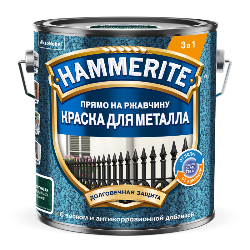Благодаря технологии Dual Tech c добавлением воска, Hammerite обеспе- чивает двойную защиту металлической поверхности от воды и коррозии. Образует износостойкое и эластичное покрытие, которое остается устойчивым и не растрескивается при перепадах влажности и температуры внутри и снаружи помещений. Hammerite обладает чешуйчатой структурой, служащей дополнительным барьером на пути кислорода и воды к металлической поверхности.