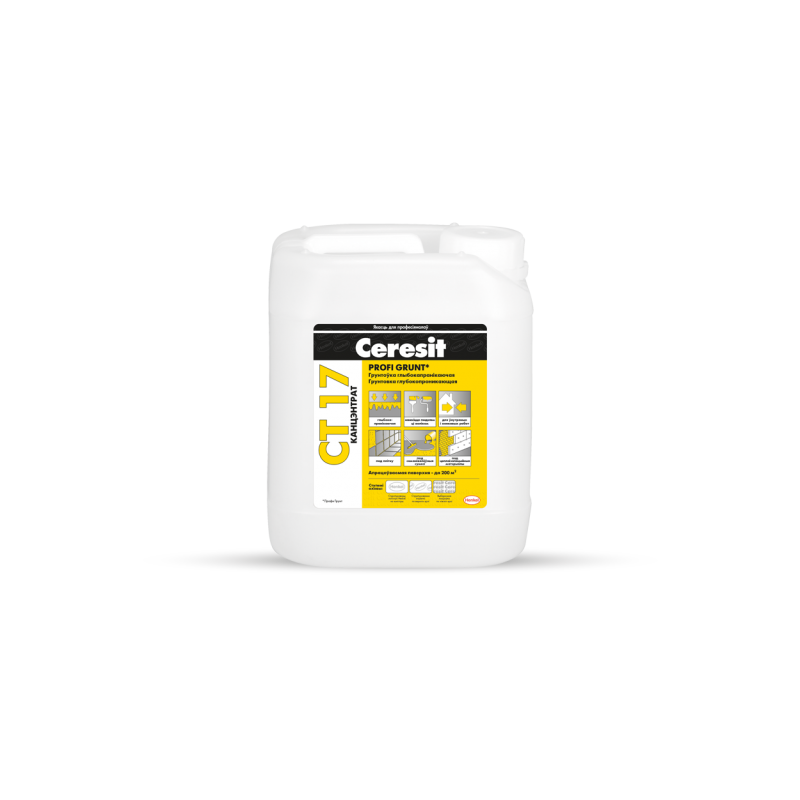 Грунтовка глубокого проникновения Ceresit CT 17 ProfiGrunt применяется для поверхностного укрепления и пропитки пористых, непрочных и сильновпитывающих минеральных оснований (легкий бетон, штукатурка, гипсовые и кирпичные поверхности) внутри и снаружи зданий перед укладкой керамической плитки, приклеиванием теплоизоляционных плит, шпатлеванием, оштукатуриванием, окраской, устройством самонивелирующихся цементных покрытий на полах. Грунтовка СТ 17 особенно рекомендуется для грунтования ангидритовых, гипсовых и ячеистобетонных оснований. Грунтовка проникает в основание и связывает зерна наполнителя, однако при этом не увеличивает прочностные параметры по всему сечению основания. Для грунтования основания под декоративные тонкослойные штукатурки отлично подойдет грунтовка церезит ст 16. При грунтовании невпитывающих оснований (керамическая плитка, OSB, ДСП и др.) необходимо использовать Ceresit CN 94.