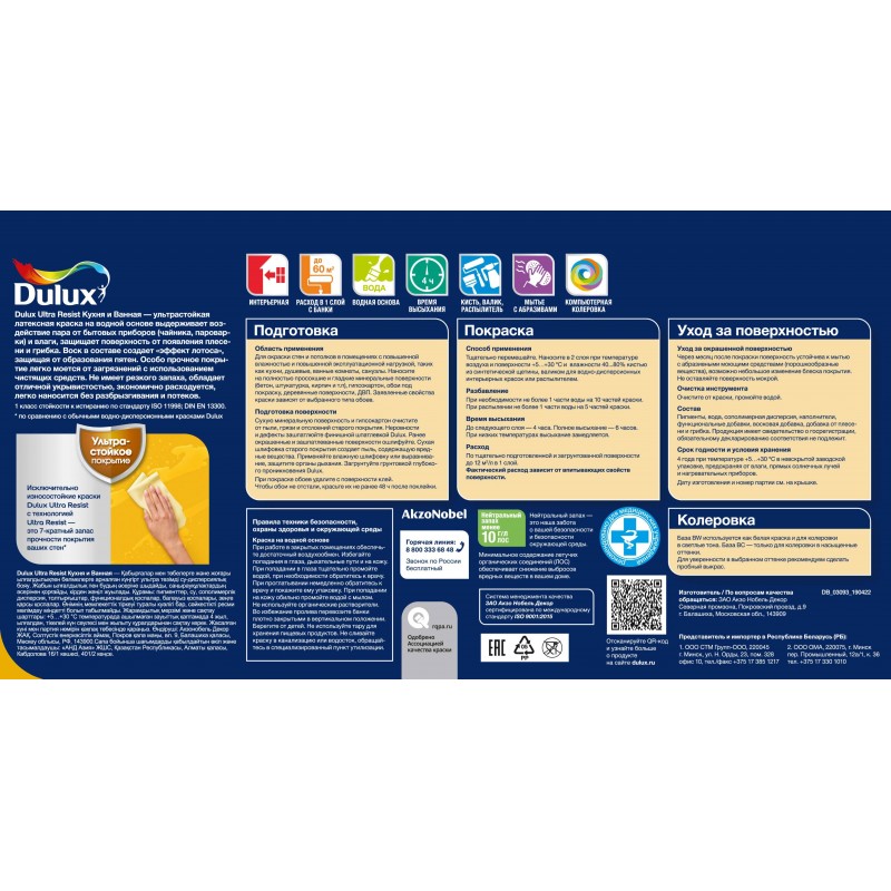 Ультрастойкая водно-дисперсионная краска выдерживает воздействие пара и влаги, защищает поверхность от появления грибка и водорослей, легко моется от загрязнений с использованием чистящих средств. Новые, исключительно износостойкие краски Dulux Ultra Resist с технологией Ultra Resist – это 7-ми кратный запас прочности покрытия ваших стен.