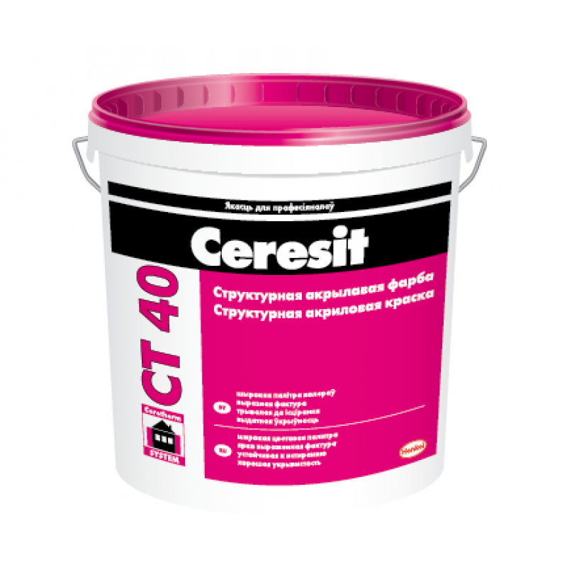 Ceresit CT 40 предназначена для окраски поверхностей строительных конструкций и элементов снаружи и внутри зданий по минеральным основаниям (бетон, кирпич, цементно-песчаные штукатурки), внутри зданий – по минеральным основаниям, в том числе гипсовым. Может служить в качестве декоративно-защитного слоя в системах утепления зданий. Также может применяться для отделки деревянных осно- ваний из ОСБ, ДСП, ЦСП и т. д. внутри помещений.