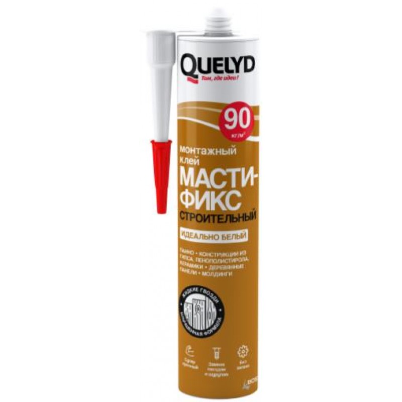 Quelyd Мастификс «Строительный» специально разработан для приклеивания различных строительных элементов, как средней тяжести, так и тяжелых. Также подходит для приклеивания дерева, ДСП, ДВП, OSB к кирпичу, камню и бетону. Также подходит для EPS и XPS, приклеивания керамической плитки к пористым основаниям.