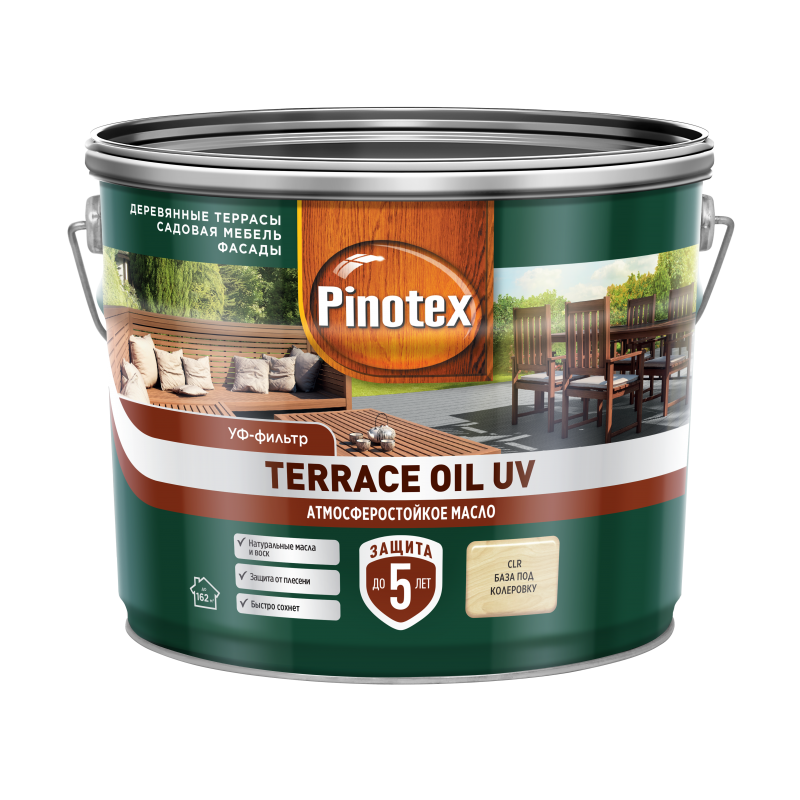 Pinotex TERRACE OIL UV -колеруемое атмосферостойкое масло для террас и садовой мебели сроком защиты до 5 лет.Полностью впитывается в поверхность, не образуя заметной пленки.