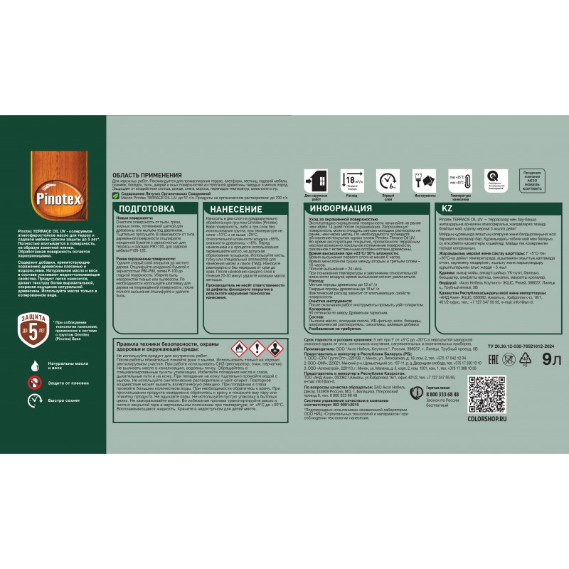 Обработанная поверхность остается паропроницаема. Содержит добавки, препятствующине поражению древесины плесенью и водорослями. Натуральное масло и воск в составе усиливают водоотталкивающие свойства. Продукт легко наносится, делает текстуру более выразительной , сохраняя ощущение натуральной древесины. Использцйте масло только в колерованном виде. Для дополнительной защиты от плесени и грибка используйте грунт-антисептик Omnitex (Pinotex) Base.